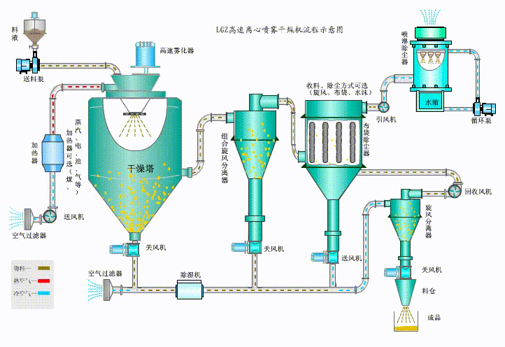 空氣經(jīng)過濾和加熱,進(jìn)入干燥器頂部空氣分配器,熱空氣呈螺旋狀均勻地進(jìn)入干燥室。料液經(jīng)塔體頂部的高速離心霧化器,(旋轉(zhuǎn))噴霧成細(xì)微的霧狀液珠,與熱空氣并流接觸在短的時(shí)間內(nèi)可干燥為成品。成品連續(xù)地由干燥塔底部和旋風(fēng)分離器中輸出,廢氣由引風(fēng)機(jī)排空。